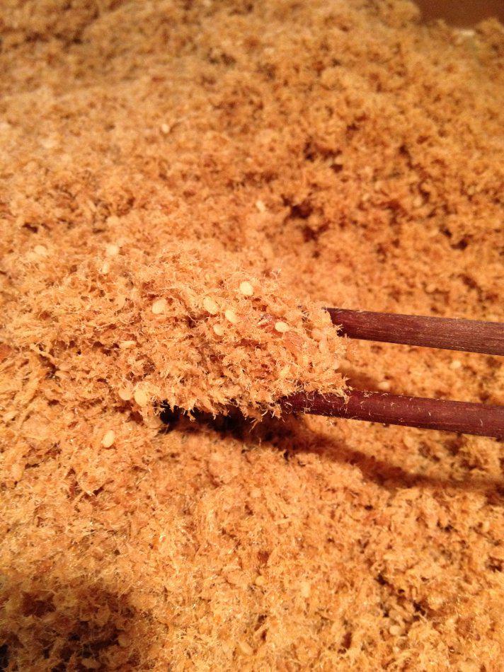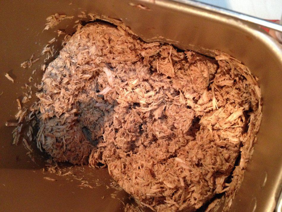 沥掉汤汁,加入糖、油、芝麻、少许五香粉,入面包桶开启和面档,搅至肉纤维成为细丝,这个过程不是太长,约20分钟。如果你的面包机有肉松或果酱程序,这时候就可以开启果酱程序玩去了……