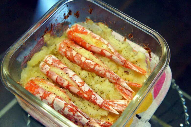 如果是对虾、明虾,开背,切到虾腹不断刀,嵌入芝士,下面铺土豆泥,表面撒少许盐入烤箱,200度20分钟。出炉撒黑胡椒。