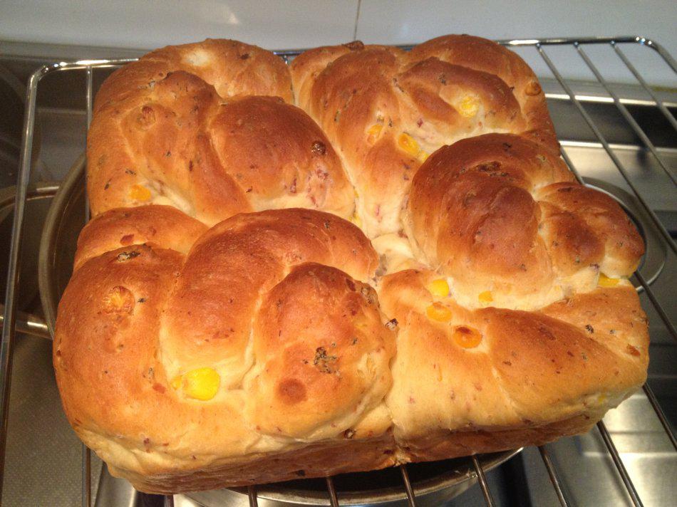 当原味面包都吃腻了以后,除了在面团里加干果葡萄干,也可以尝试着做成咸味面包,加煎过的培根和过水后沥干的玉米。