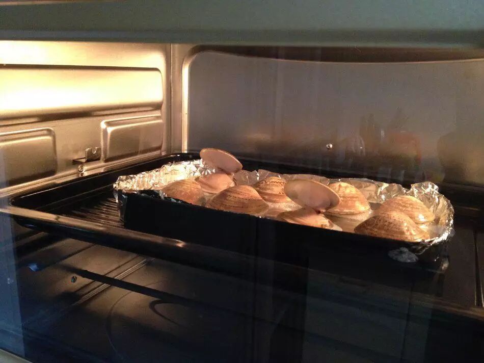 大青蛤,吐尽沙后刷一刷洗一洗,平铺入烤箱,200度15分钟。