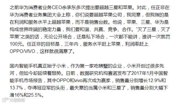 不管华为裁员消息是否属实,有一个事实必须承认,华为的消费者业务表面上很风光——2016年智能手机发货量达到1.39亿台,紧追苹果、三星,以11.3%的市场份额位居全球第三位,但一份来自美国研究公司StrategyAnalytics的报告泼来一盆冷水:2016年第三季度,全球智能手机市场总营业利润为94亿美元,而苹果用11%的市场占有率,攫取了全球手机市场91%的利润。而华为、Vivo和 OPPO虽然分列二三四名,但利润占比仅为2.4%、2.2%和2.2%。