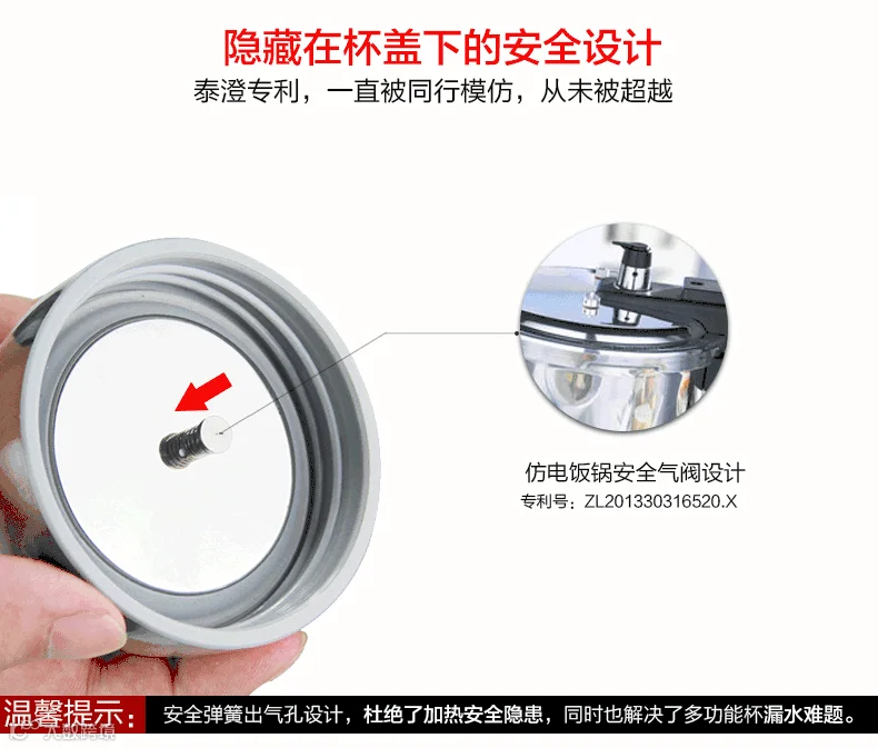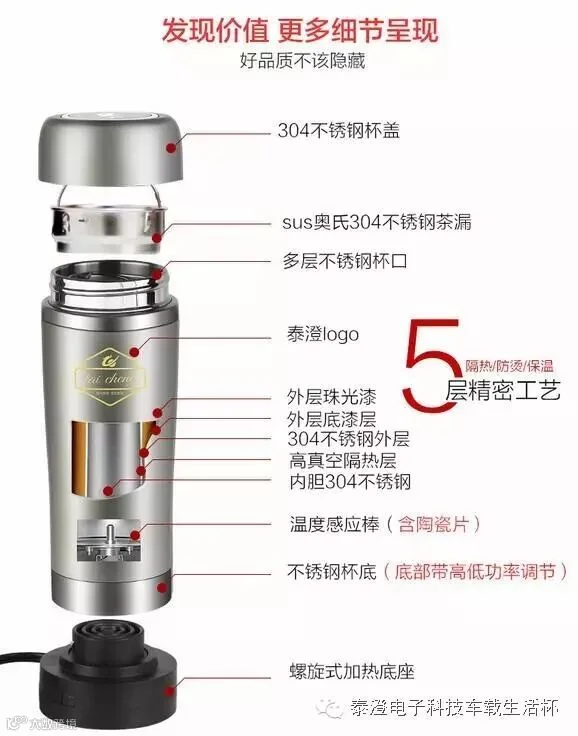最后是智能性。泰澄车载杯可车用,家用,车家两用,有多种电压可选。车载杯在加热沸腾结束后可自动断电,保温长达6小时,在电源没有移除的情况下,低于50度自动开启加热。杯盖下有仿电饭锅安全气阀设计,安全可靠。车载杯水量也是采用350mL黄金容量,符合中国人的喝水标准。