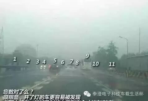 雨天阴暗,务必打开车灯。开灯不是为了看清前路,而是让前车能从反光镜看见你。雨天开灯事故率及交通死亡率能降低30%。 车辆只要启动后,开灯不费电。不要考虑电瓶费电的问题。