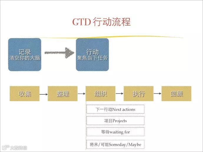组织:对参考资料的组织主要就是建立一个文档管理系统,对下一步组织,可分为:下一步行动清单,等待清单和未来/某天清单。