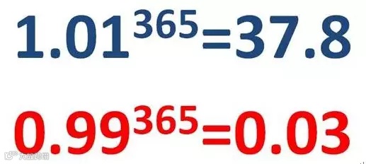 1.01=1+0.01,也就是每天进步一点。1.01的365次方也就是说你每天进步一点点,一年以后,你将进步很大,远远大于“1”