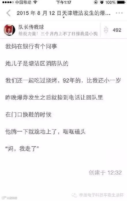 塘沽爆炸后,两名消防队员的微信对话截图,让人看完泪奔。一名消防人员奔赴前线之前,给另一名同事这样留言:我要是没回来,我爸就是你爸。