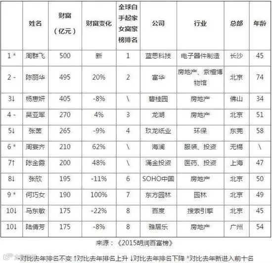 女富豪前十名门槛比去年上升30%,达到175亿元,其中蓝思科技的周群飞、海澜的周宴齐、东方园林的何巧女为 新进前十的女富豪。前十名女富豪的平均年龄为51岁,比女富豪总榜大5岁,比百富榜总榜年轻3岁。房地产是前十名女富豪的主要财富来源,有5位从事房地产 行业。有8位同时登上《2015胡润全球白手起家女富豪》前十名。全球白手起家女富豪前十名中,从事房地产的也居多,占36%。