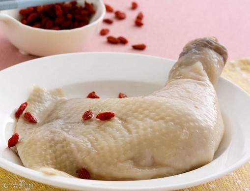 2、将腌渍过的鸡腿上笼蒸约15分钟取出,拣去葱、姜、花椒。