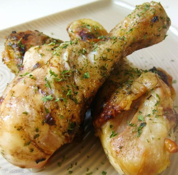 鸡腿6只、蒜2瓣、欧芹碎2茶匙、柠檬汁4汤匙、橄榄油3汤匙、生抽2茶匙、盐适量、黑胡椒适量