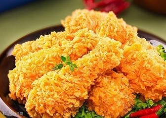 3、炒锅上火,倒入油,烧至七八成热时,将鸡腿投入炸呈金黄色,捞出装盘,撒上花椒盐即成。