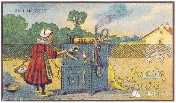 全自动联合收割机。联合收割机现在已经普及,只是像图中那样不用驾驶,而且一个人就能操作很多台,现在并没有实现。但是你不得不为当时人们的丰富想象力所折服。