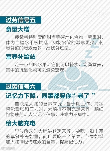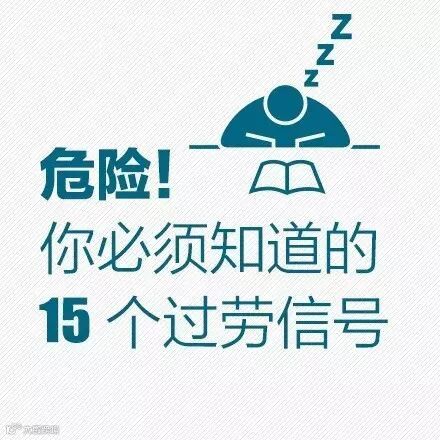 【你必须知道的15个过劳信号】是不是常觉得眼睛发酸干涩、记忆力下降、反应变迟钝、决策力下降?其实这都是过劳的信号!据统计,30岁至50岁英年早逝的人群中,95.7%的人死于因过度疲劳引起的致命疾病。戳图↓↓↓~15个你必须知道的过劳信号,自测一下,别让勤劳变过劳!