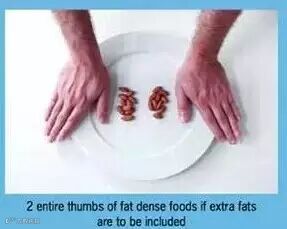 男女每餐摄入量分别为2个拇指和1个拇指大小。包括食用植物油、黄油、坚果油和植物种子等。