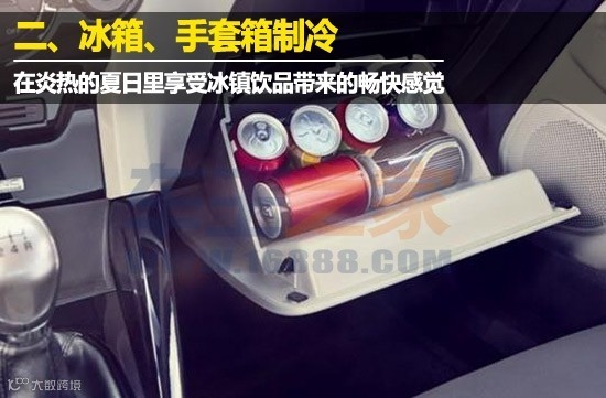 此外不少车在手套箱里也有空调出风口,使手套箱内可以实现制冷。当空调系统工作时,压缩机制造的冷气在通往车内的同时,也会通过手套箱的制冷口使手套箱降温。手套箱制冷并不会增加发动机负担,并且由于手套箱空间相对狭小,制冷温度会更低。也可以将食物和饮料置于手套箱中,这样在炎炎夏日,就能随时随地享受冰镇饮品带来的畅快感觉。