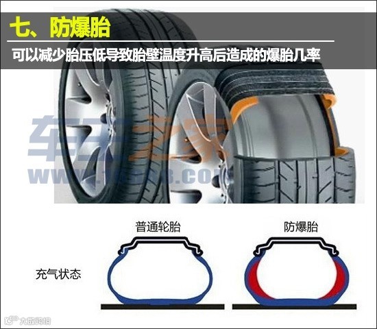 通常情况下亏气保用轮胎可以在轮胎亏气甚至0胎压的情况下,依靠坚硬的轮胎侧壁支撑车辆正常行驶相当长的一段距离。但当高速上遭遇锐利硬物划伤也一样会发生爆胎,因此防爆胎这种称呼很片面。只不过这种轮胎胎壁极为坚硬,可以减少尤其是由于胎压降低长时间行驶导致胎壁温度升高后造成的爆胎几率。需要注意的是,当出现轮胎亏气时,尽量将亏气轮胎放在后轮的位置上,否则前轮若亏气,对于转向、整体操控都有严重影响,直接关乎安全。