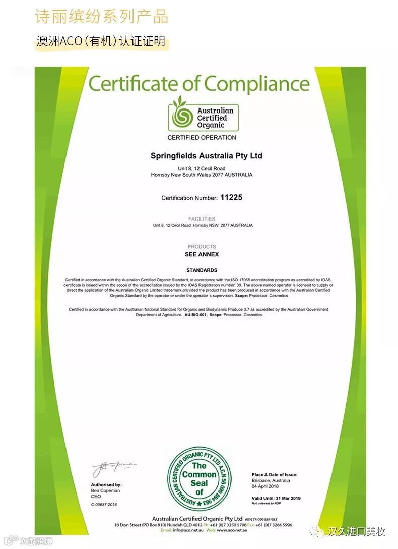 ACO澳洲有机认证(AustralianCertified Organic)是澳洲最大的有机或生物生产认证中心,而且ACO认证标准也是国际上最严格的有机标准之一。诗丽缤纷的系列产品都通过了认证,这是一道安全的保证。