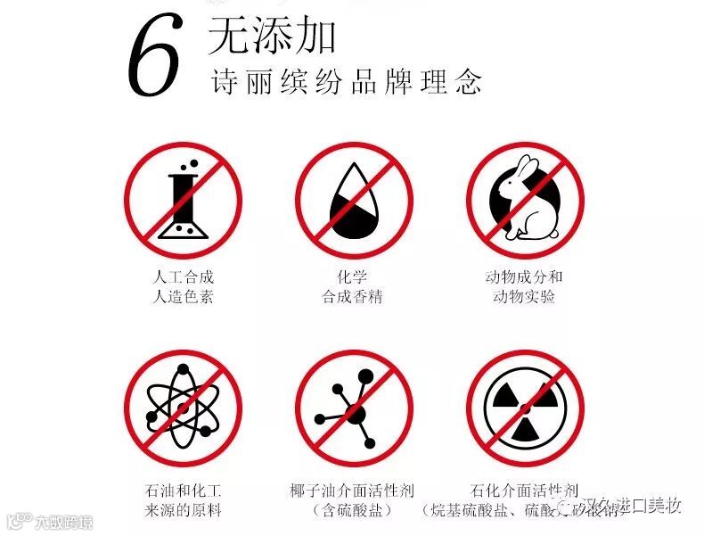 作为崇尚天然有机的护肤品牌,诗丽缤纷的产品严格遵守6大无添加的生产准则,承诺在产品中不添加人工合成的香精及色素、动物成分、石油和化工来源的原料、椰子油介面活性剂介面活性剂、石化界面活性剂,让肌肤享受来自大自然有机护理。