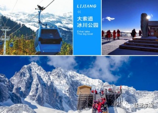 早餐后前往云南民族特色玉文化中心,随后了解云南银饰文化的源远流长。午餐后游览具有“东方瑞士”之称的国家5A级景区【玉龙雪山风景区】,赠送【冰川大索道】(每年旺季,黄金周,冰川大索道限票。如遇不可抗拒因素,大索道更改为云杉坪索道)是雪山大索道的起点站,一片茂密的原始森林,这里海拨3356米,索道由此往上运行,直至雪山主峰扇子陡正下方的上部站,那里海拨4506米。索道全长2914米,垂直高差1150米,是我国海拨最高的旅游客运索道之一,后游览【蓝月谷】不含环保车,白水河,甘海子,蓝月谷尤如安好的女子,静静的不说话,风华在无人所知的明暗处。玉龙雪山的水流经到这里,由于地表的矿物质,幻化出迷人的色彩。我见过湘西苗寨碧潭的水,见过四川九寨五彩的水,但是这些水与蓝月谷的水比起来,都少了一分淡然的仙气儿。晚上赠送(价值260元)《丽水金沙歌舞表演》择取丽江各民族最具代表性的文化意象,以舞蹈诗画的形式加以表现,成为丽江古城吸引游客的又一亮点。丽水金沙以舞蹈诗画的形式,荟萃了丽江奇山异水孕育的独特的滇西北高原民族文化气象、亘古绝丽的古纳西王国的文化宝藏,择取丽江各民族最具代表性的文化意象,全方位地展现了丽江独特而博大的民族文化和民族精神。《丽水金沙》共分四场:"序"、"水"、"山"、"情"。晚餐可以自行品尝丽江特色小吃。(晚餐自理)〖温馨提示〗