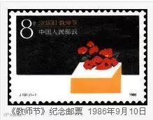 1986年9月10日,为宣传教师节重大而深远的意义,原邮电部发行一套“教师节”纪念邮票,全套1枚,面额8分。张磊设计。影写版。齿孔11度,背面刷胶。邮局全张枚数56。北京邮票厂印刷。票幅规格40毫米乘27毫米。发行量5990.69万枚。图案由黑板、讲台和献给老师的鲜花组成,既概括地表现出了教师特殊的工作环境,也表达了全国人民对教师的尊敬和学生对教师的热爱之情。黑板上显出几道淡淡的白色粉笔痕迹,仿佛刚刚檫完黑板,老师马上就要开始讲授新的一课,突出表现了教师辛勤劳动的精神风貌。票名、铭记和面值等文字设计在黑板的左上角,而且采用黄色与白色,既像老师自然书写在黑板上的文字,增强了黑板的实体感,又和画面下部的白色粉墙和黄色讲台相呼应,具有一种和谐美。讲台上放了一束鲜花,献给人民教师,构思新颖,洋溢了节日气氛。