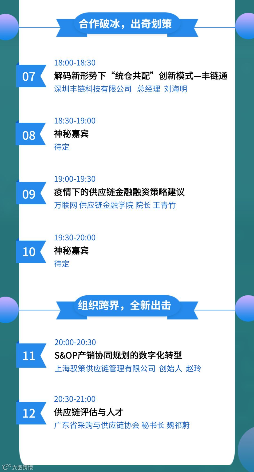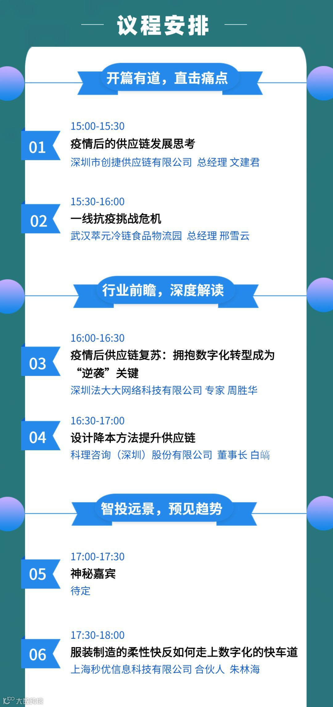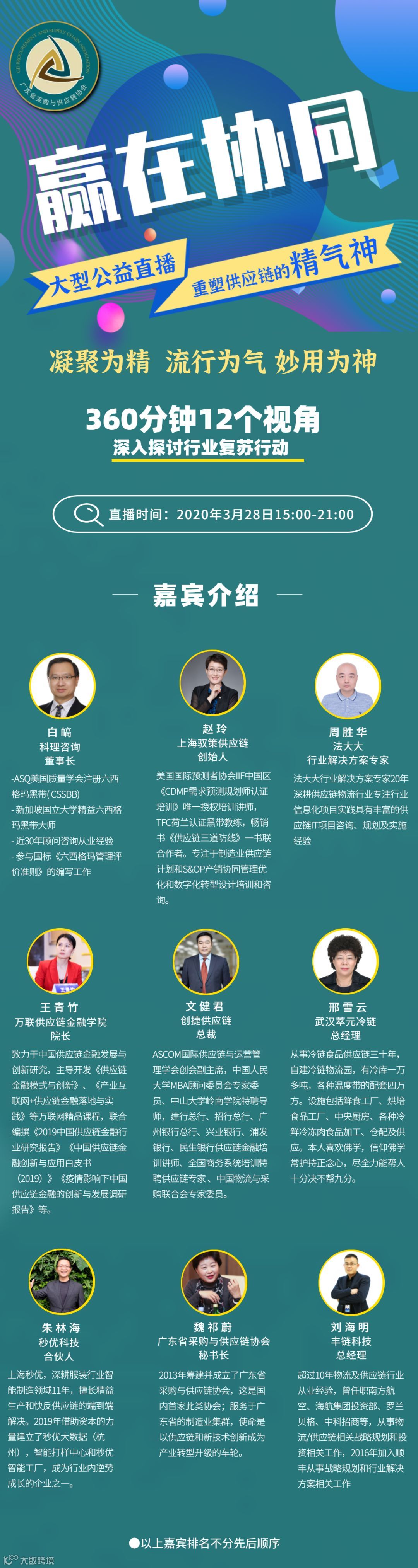 直播内容:我们将对此次疫情五大行业版块中小企业解困出谋划策,所请嘉宾皆为实干家,不讲大道理,只有救命干货!而所有行业与企业都是供应链上的一环,越是迷茫期越要看清全链条运行状态,才知当下该怎样布局与决策!因此,我们开创360分钟(6小时)12个视角大型直播论坛形式,全角度全维度,从思维突破到工具使用,为您破局当下困境,安稳渡过此关;顺势而为,谋划更有生命力的未来!期待与您在线上相聚,不见不散!