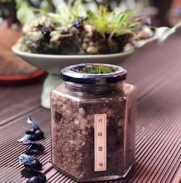 制成中药后,就是我们说的咸竹蜂。味甘酸,性寒,无毒。消炎镇痛、清热化痰、祛风泻火。对扁桃体发炎、口疮、咽痛、小儿惊风有很好的消炎功效。野生竹蜂用盐埋腌一层盐一层竹蜂,制成天然咸竹蜂盐。
