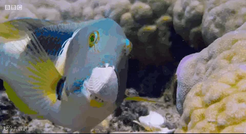 猪齿鱼翻开珊瑚堆,吹开细沙,四处寻找它心爱的食物:一种蛤蜊,然后叼起蛤蜊搬运到“厨房”,用嘴叼着它一次两次…...砸向珊瑚礁,直到蛤蜊的外壳破砸碎,这时猪齿鱼才得以享用美食!