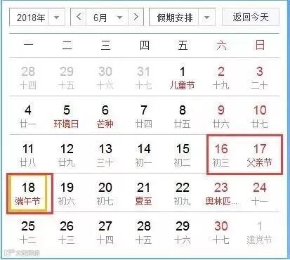 2018年端午节是6月18日星期一。2018年端午节放假安排:6月16日-6月18日,共放假3天。