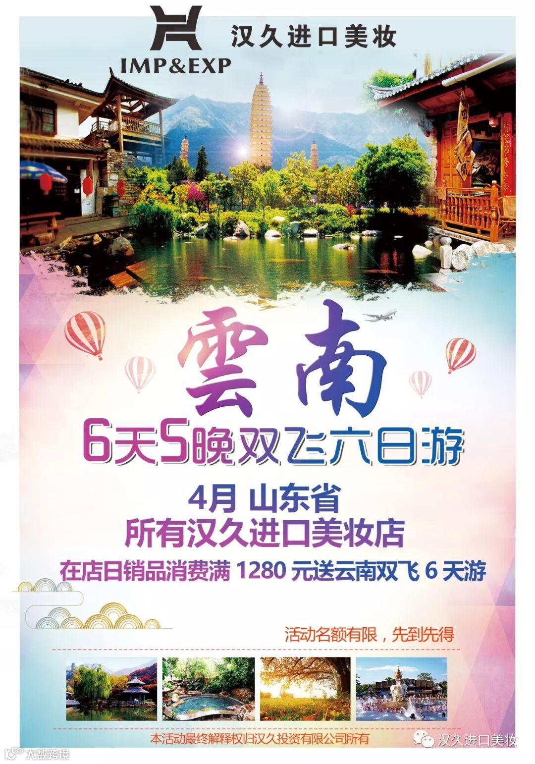 在店日销品消费满1280送云南双飞6天游!