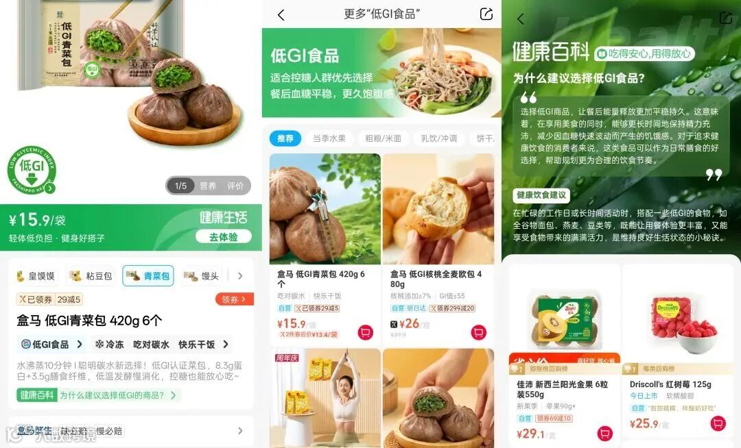粮油与蔬果是低GI的“基础盘”。盒马的“米抗儿”低GI大米、叮咚买菜定制低GI70荞麦面,让日常主食“换个方式更健康”;