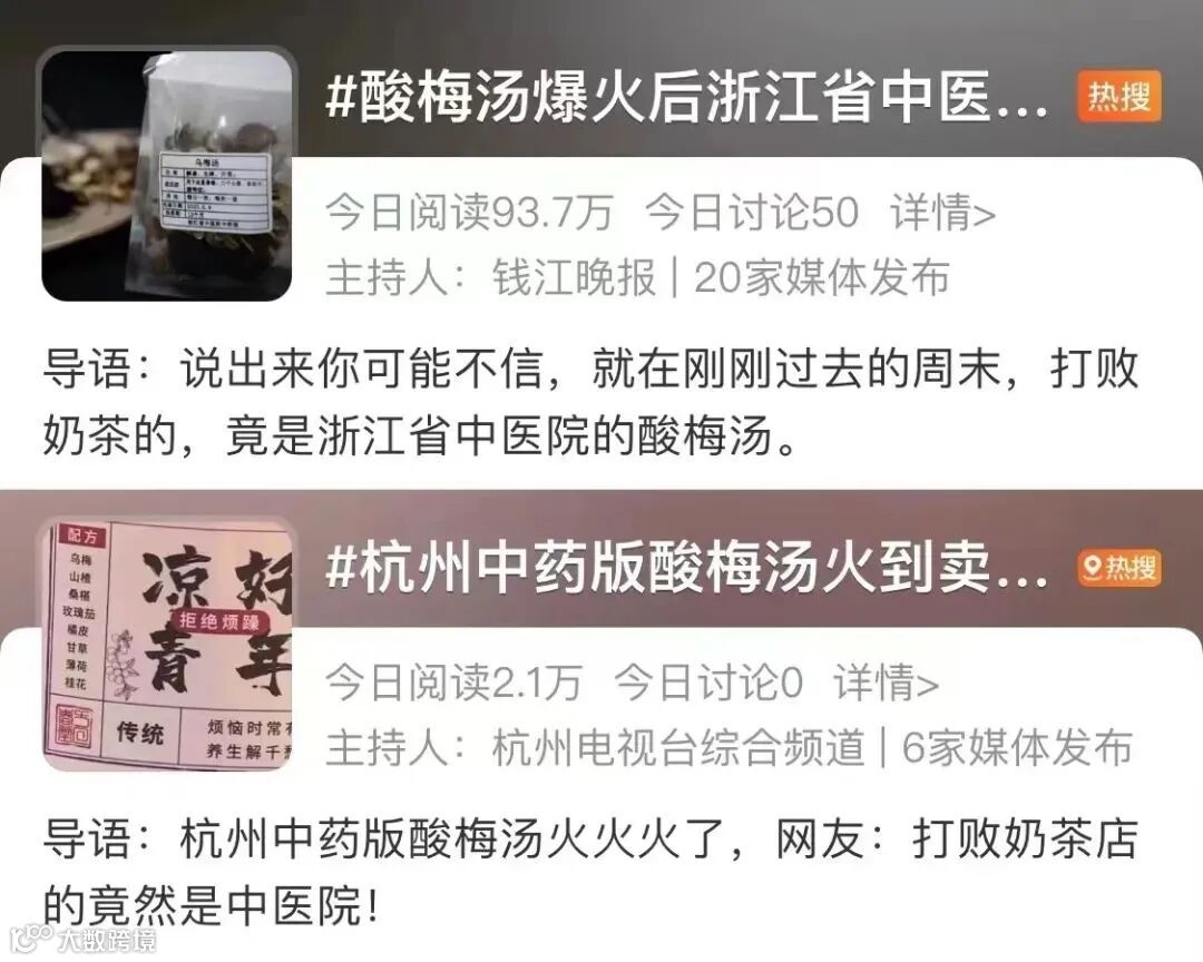 最近,除了“美酒加咖啡”的酱香拿铁爆火出圈的同时,浙江省中医院线上平台1.34元一贴的中药酸梅汤也成为了年轻人的心头爱,没有奶茶的植脂末和糖精,好喝还能调养身体,不禁感叹,老祖宗流传下来的中药茶饮也有顶流“冰中式”。