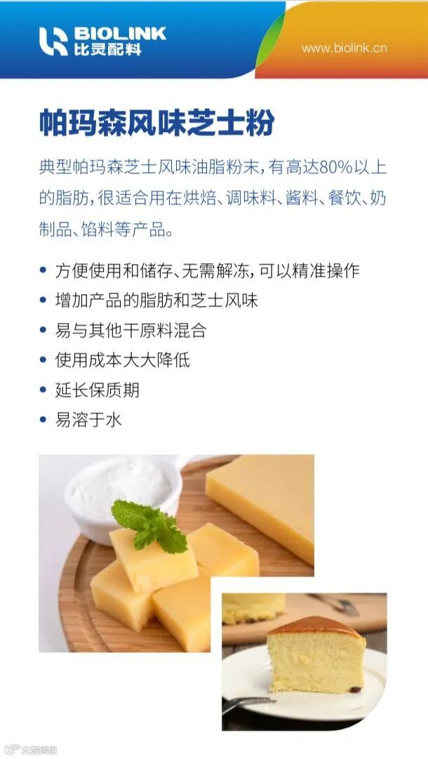 其中还细分了不同风味满足各种客户需求。黄油风味脂肪粉含有高达85%的脂肪量,提供饱满黄油风味。帕玛森风味脂肪粉提供经典帕玛森芝士风味。
