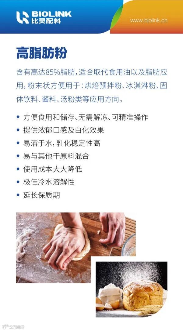 高脂肪粉采用领先的低温喷雾高燥技术,脂肪含量可高达80%。口感能享受到浓郁脂肪感和白化效果,却不会有在产品表面有浮油现象。可应用于烘焙预拌粉,冰淇淋粉,固饮,酱料汤粉等。