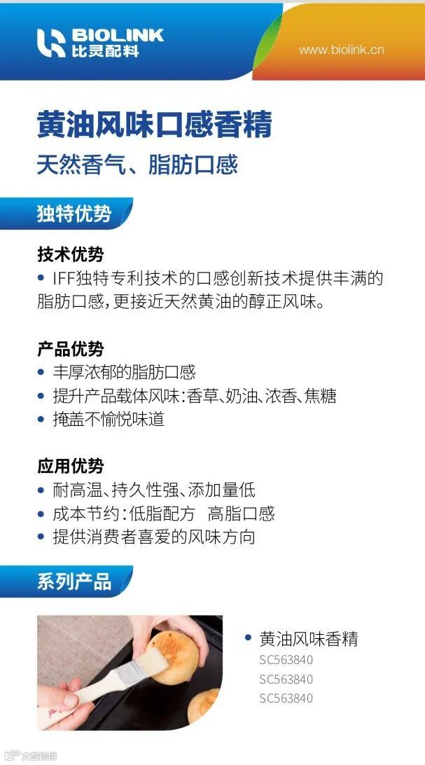 IFF黄油风味口感香精除了具有典型独特的黄油头香外,更具有丰满黄油脂肪口感,使烘焙产品风味提升,或者能帮助降低工业成本。