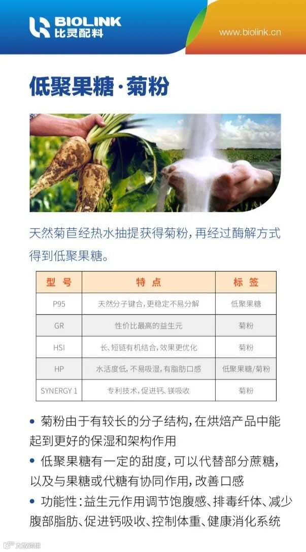 减糖已经成为近几年的食品大趋势,在烘焙行业也出现了越来越多的减糖风潮。比利时Orafti旗下的Beneo的菊粉和低聚果糖由天然菊苣中提取而来。可代替部分蔗糖。众多健康效果,例如益生元作用调节饱腹感,排毒纤体,促进钙吸收等等。