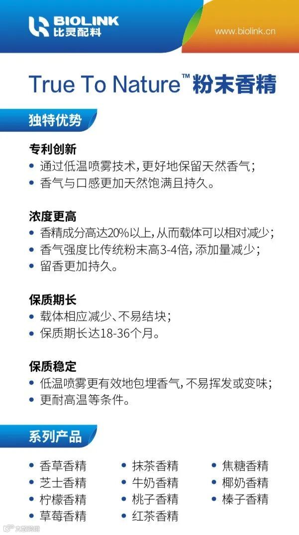 True To Nature粉末香精的低温喷雾干燥的包埋技术更好捕捉原有香气,香精成分高达20%。更耐高温。有众多风味供选择,例如T2N草莓、芝士、柠檬香精等。对不同口味需求的烘焙预拌粉提供还原真实口感的强大助攻。