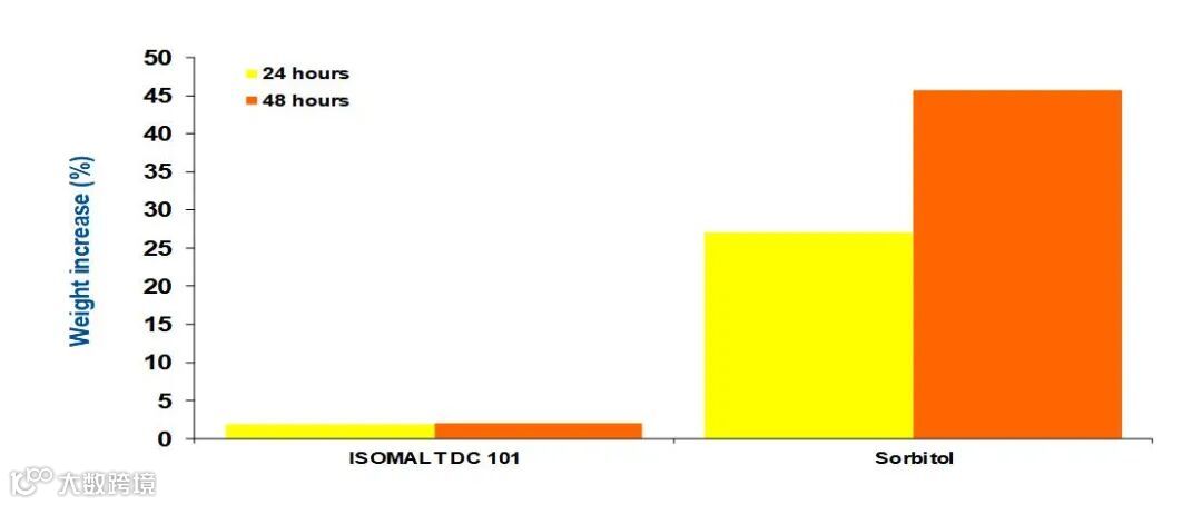 实验数据证明,益寿糖™(异麦芽酮糖醇)吸湿性远远低于山梨醇。