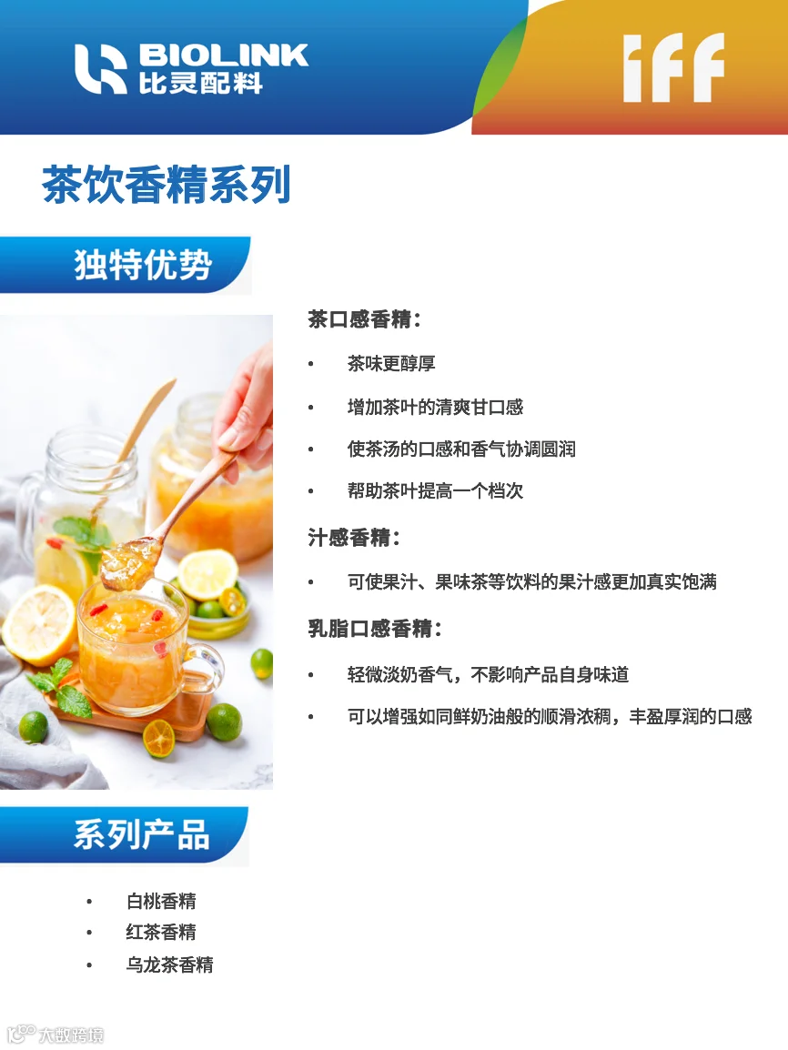 有了比灵的茶味香精,这些标准化困难的问题都能一一被解决。这一系列产品能为您提供自然醇正的茶香、清香甘甜口感。完美地呈现出浓郁茶汤和天然醇厚香气。