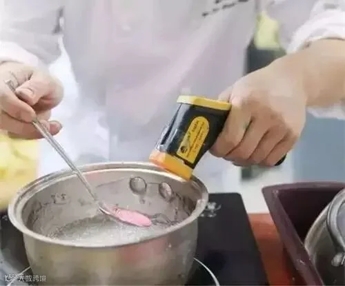 从食品袋里舀出适量进口益寿糖倒进不锈钢容器,在电磁炉上高温熬煮数分钟,颗粒状的益寿糖变成了粘液状的糖浆。当糖浆的温度达到160度时,就可以准备制作糖艺作品了。