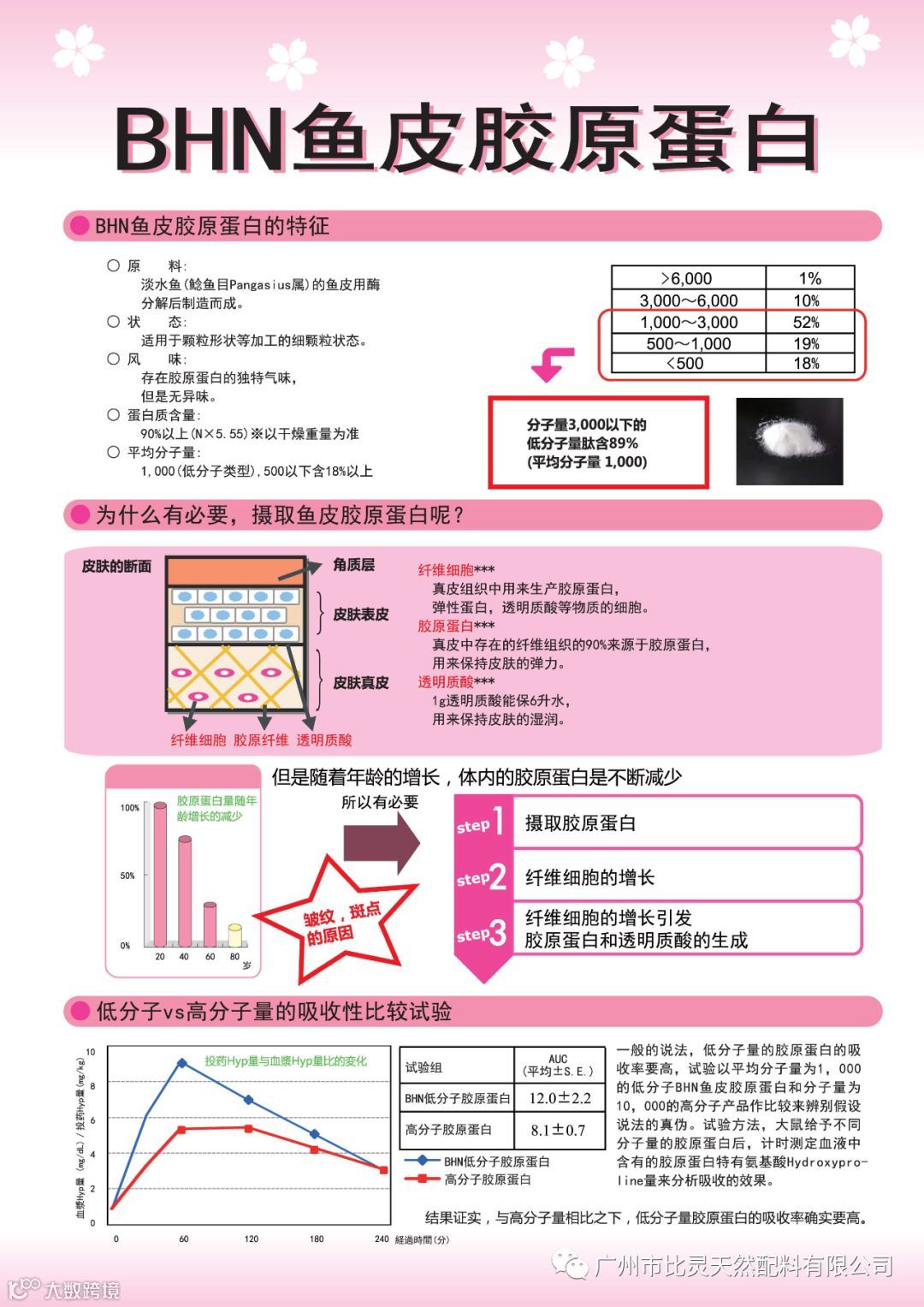 胶原蛋白是一种生物性高分子物质,是一种白色、不透明、无支链的纤维性蛋白质。它可以补充皮肤各层所需的营养,使皮肤中胶原活性增强,有滋润皮肤,延缓衰老、美容、消皱、养发等功效。根据《肽营养学》(北京大学公共卫生学院营养与食品卫生学系教材)提出,分子量在1000道尔顿以下的胶原蛋白无需分解可被人体直接吸收,在口服吸收及外用护肤方面效果明显。