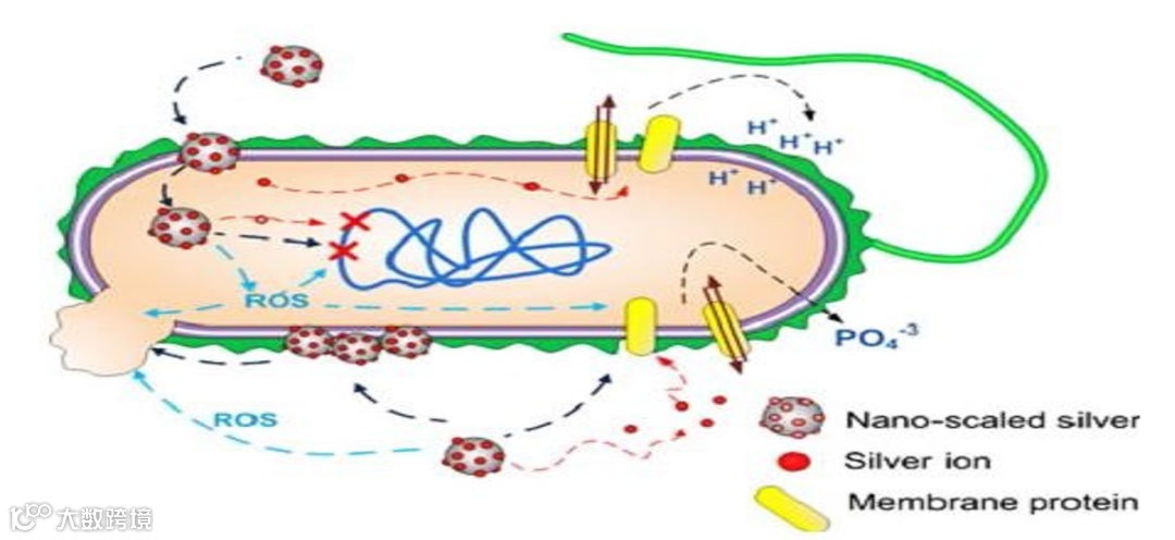 Ag+能阻断ATP的生产,破坏DNA的复制,Ag+能产生活性氧自由基ROS,与DNA相结合,置换DNA分子双螺旋结构中的氢,从而导致细菌DNA分子结构变形,抑制DNA、RNA、蛋白质的合成,使细菌失活。