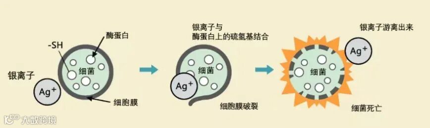 细菌细胞膜带有负电荷,Ag+能依靠库伦引力牢固吸附细胞膜,与细胞壁发生肽聚糖反应,造成细菌固有成分被破坏或生产功能障碍。 Ag+进一步穿透细胞壁,导致细胞壁的破裂,细胞质外流,最终使细菌死亡。