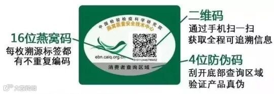 燕窝的生产企业和燕屋在原产国(印尼、马来西亚)和中国两地注册和备案,接受监管,进口的燕窝在接受进口国农业局、进口国兽医局、中国质检总局、认监会、中国检科院、进出口检验检疫、中国海关的检验后,销售包装上加贴CAIQ溯源码标签。为消费者识别和选购获华注册企业的合法进口燕窝产品提供简便有效的方式。