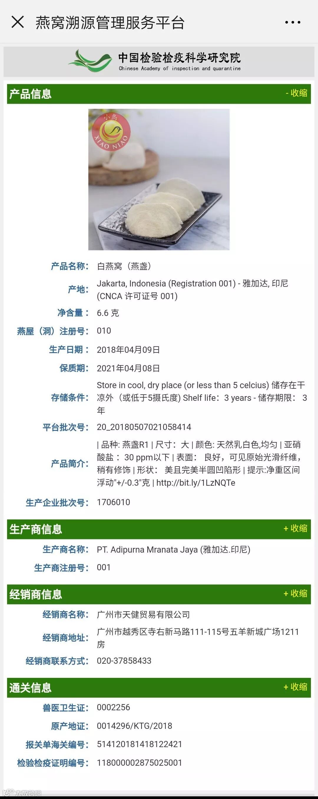 通俗一点来说,溯源码就是燕窝的“身份证”,记录了这盏燕窝的全部身世,是正品标志,实现了“燕屋—加工企业—进出口商—经销商—消费者” 全程可追溯,从而保护消费者的合法权益。