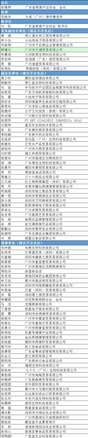 11月25日,“2020燕窝行业年会”、“广东省燕窝产业协会第三届换届大会暨三届一次会员代表大会”在广州融创万达文华酒店顺利举行,广东省燕窝产业协会领导及各理事会成员、会员代表近300人参加本次会议。广东省燕窝产业协会作为国内最早的燕窝行业组织,也是目前唯一具有独立法人资质的专门燕窝协会,自2013年1月成立至今,积累了大量行业资源信息,多次组织行业交流活动、公益扶贫活动,大力倡导行业诚信自律、合法合规经营、创新突破发展的良好风气,积极协助政府监管部门规范燕窝市场秩序,维护消费者合法权益,踏实践行国家“一带一路”政策发展,多措并举,扎实推进中国燕窝产业健康可持续发展。同时,大会选举产生了新一届协会理事会,大会推选天健燕窝集团CEO韩曙光女士为常务副会长广东省燕窝产业协会第三届理事会名单天健燕窝集团 CEO 韩曙光女士会上,燕协会长简述了近年来燕协的发展历程和突出成绩,并且表示,东盟是燕窝的主要原产地,希望能借此机会着力行业上下游长远发展,胸怀使命,精诚合作,同力把燕窝行业推向新的高度。为进一步推动燕窝行业全球化、规范化、资源化发展,燕窝行业必须要建立相关的行规行约,倡导行业合法合规,诚信自律。协会要充分做好政企纽带作用,了解国家政策,倡导行业在合法合规经营的基础上,拓展渠道,开拓创新。打通燕协全域交流网络,大力宣扬推广“东方千年滋补文化”,将具有东方智慧养生特色的健康食品“燕窝”推向新的高度,引领燕窝走向世界,助力燕窝行业新兴发展。