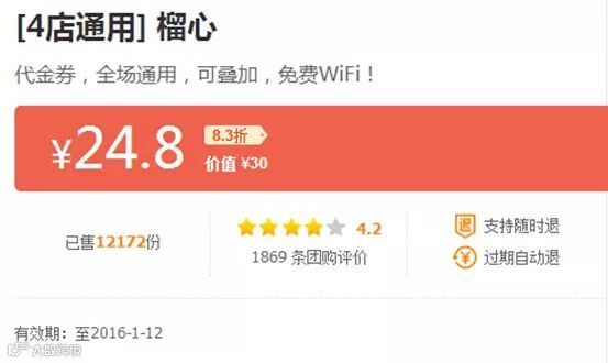 即日起至2016年1月12日,到大众点评网可以$24.8购买价值$30的代金卷噢~