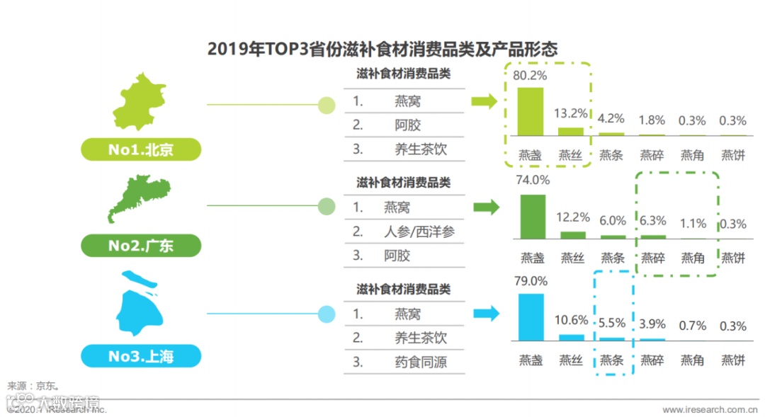 此外,据艾瑞咨询发布的《中国大健康消费发展白皮书》显示,保健品养生无分南北,品类区域消费共性明显,同时在滋补养生方面,南北地区TOP1选择均为进补燕窝。