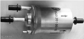 注:汽油滤清器有化油器式和电喷式之分,使用化油器的汽油发动机,汽油滤清器位于输油泵进口一侧,工作压力较小,一般采用尼龙外壳,电喷式发动机的汽油滤清器位于输油泵的出口一侧,工作压力较高,通常采用金属外壳。