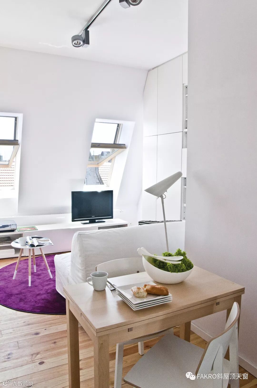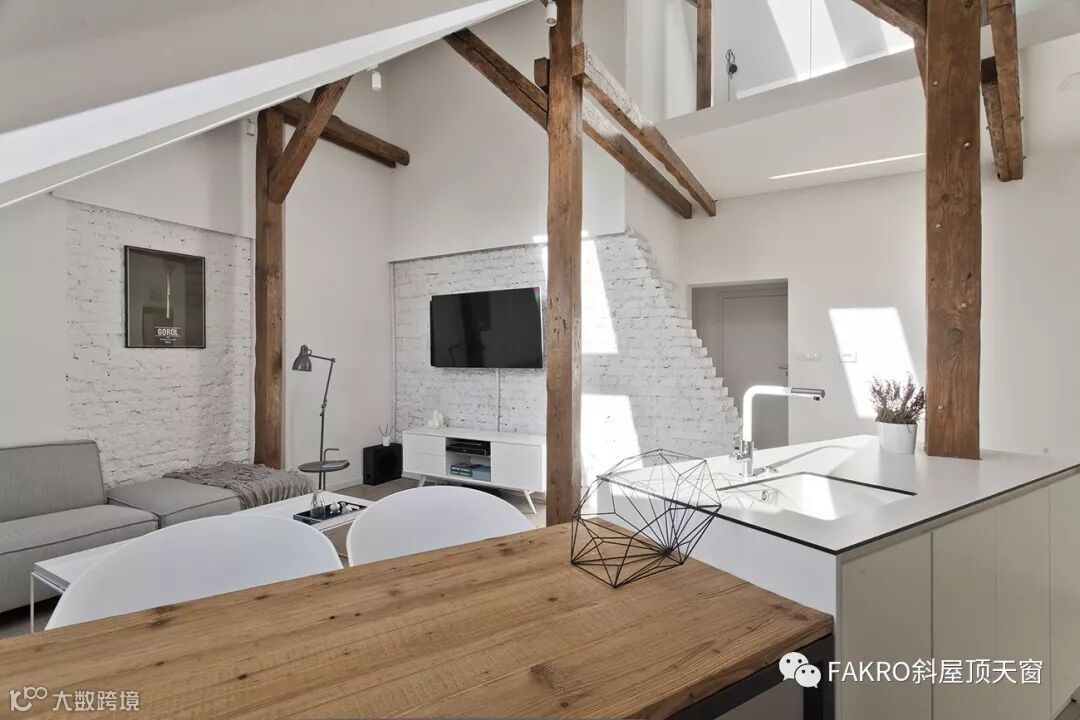 图3 在过去的十年中已经成为非常流行的阁楼开放空间。客厅、厨房和餐厅布局在同一个屋檐下,通过使用明亮的颜色和fakro天窗透入的自然光是内部空间得到进一步增强。