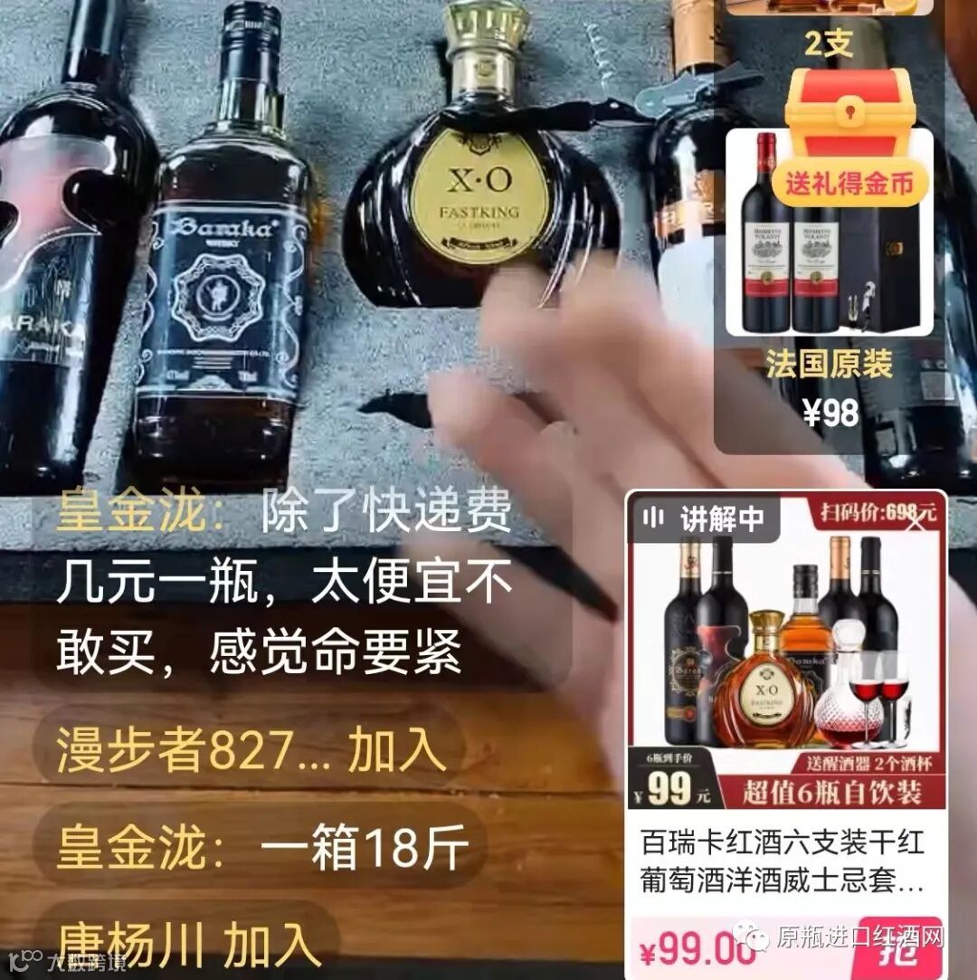 直播销售的原瓶进口酒99元6瓶,送醒酒器+红酒杯包邮
