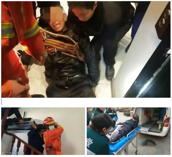 在长达1小时的抢救后,消防指战员成功地将伤者救出,消防指战员小心地抬下楼梯,交给现场120救护车,送往医院。
